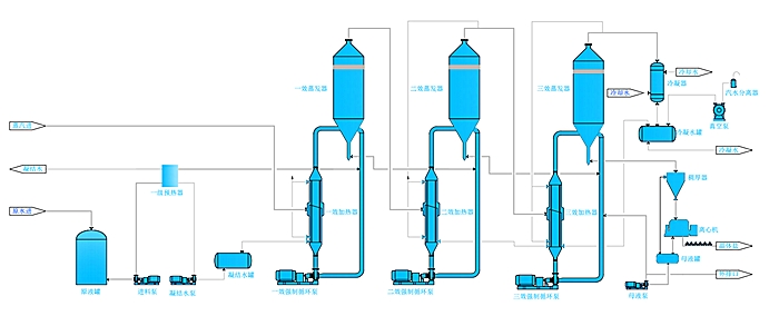 在多效蒸發(fā)器中,可將二次蒸器當(dāng)作加熱蒸汽,引入另一個蒸發(fā)器,只要后者蒸發(fā)室壓力和溶液沸點均較原來蒸發(fā)器中的為低,則引入的二次蒸汽即能起加熱熱源的作用。同理,下個蒸發(fā)器新產(chǎn)生的新的二次蒸汽又可作為第三蒸發(fā)器的加熱蒸汽。這樣,每一個蒸發(fā)器即為一效,將多個蒸發(fā)器連接起來一同操作,即組成一個多效蒸發(fā)系統(tǒng)。加入生蒸汽的蒸發(fā)器稱為一效,利用一效二次蒸汽加熱的成為二效,依次類推。